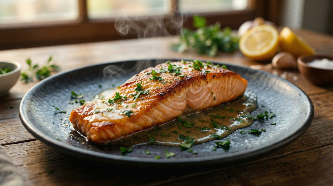 • 🐟 ნაზად შემწვარი ორაგული ლიმონ–კარაქის სოუსით