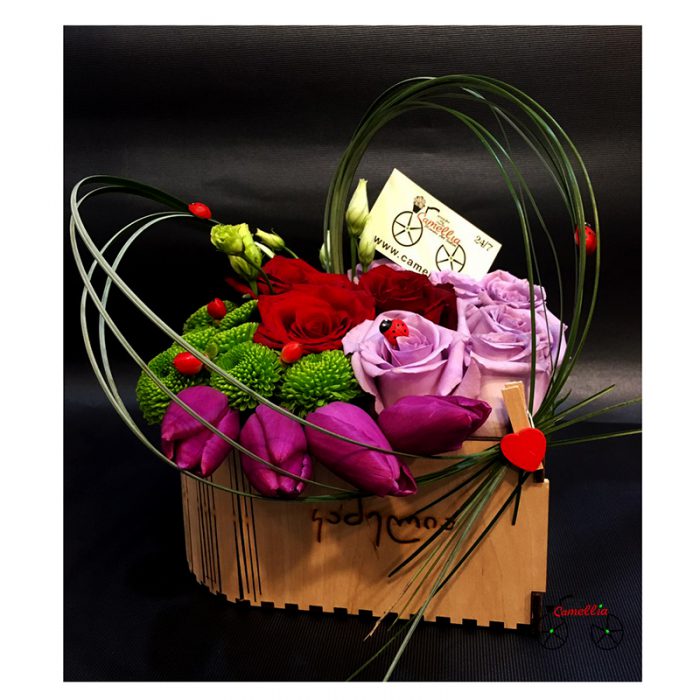 უმაღლესი ხარისხის ჰოლანდიური ყვავილების მიქსი გულის ფორმის ხის კოლოფში.